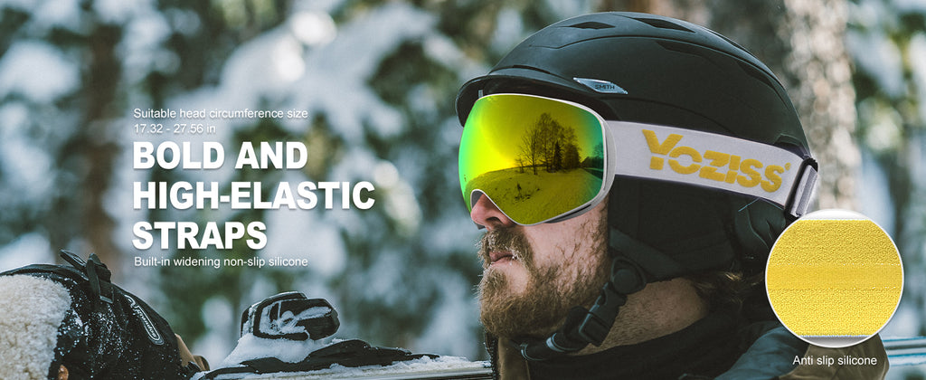 Universal Helmet Compatible: Thickened silicone on the straps of are suitable for all head shapes and sizes. Make your Ski Glasses can not shake off, keeps it in place even under extreme sports conditions.