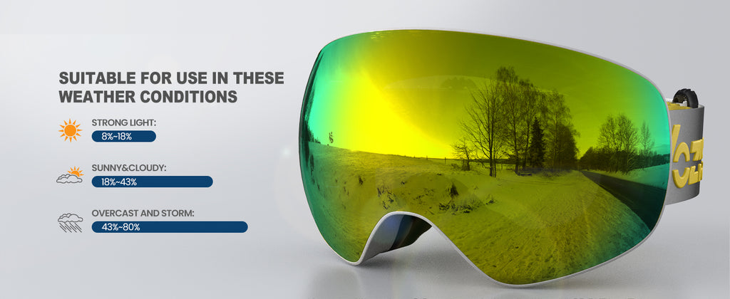 Yoziss brand new Skiing Goggles for Women and Men: Designed with a 13.25% VLT(Visible Light Transmission), suitable for Sunny or Sunlight Cloudy Days weather. Its 180°spherical Lenses provide you a wide field of vision.